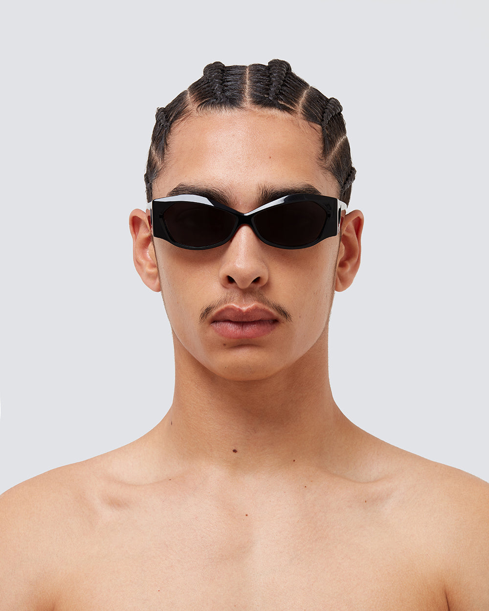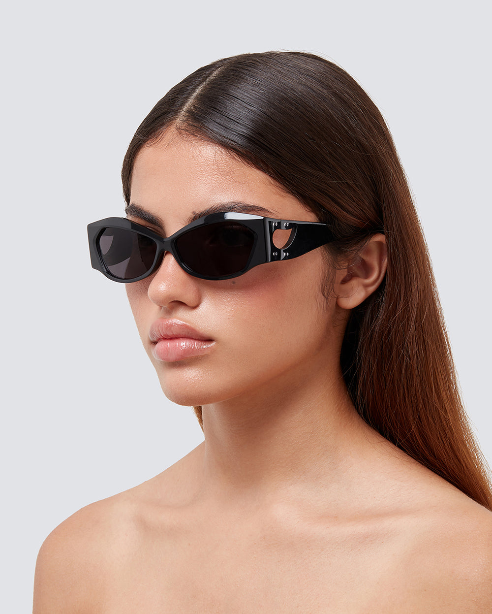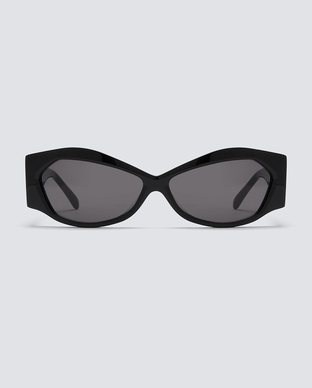 ALKA BLACK are unisex sunglasses featuring a geometric, cat eye silhouette in black acetate with tone-on-tone black lenses. Their bold design is emphasized through the thickness and angularity of the frame, as well as the teardrop shaped cut-out at the hinge where the frame meets the temples.
