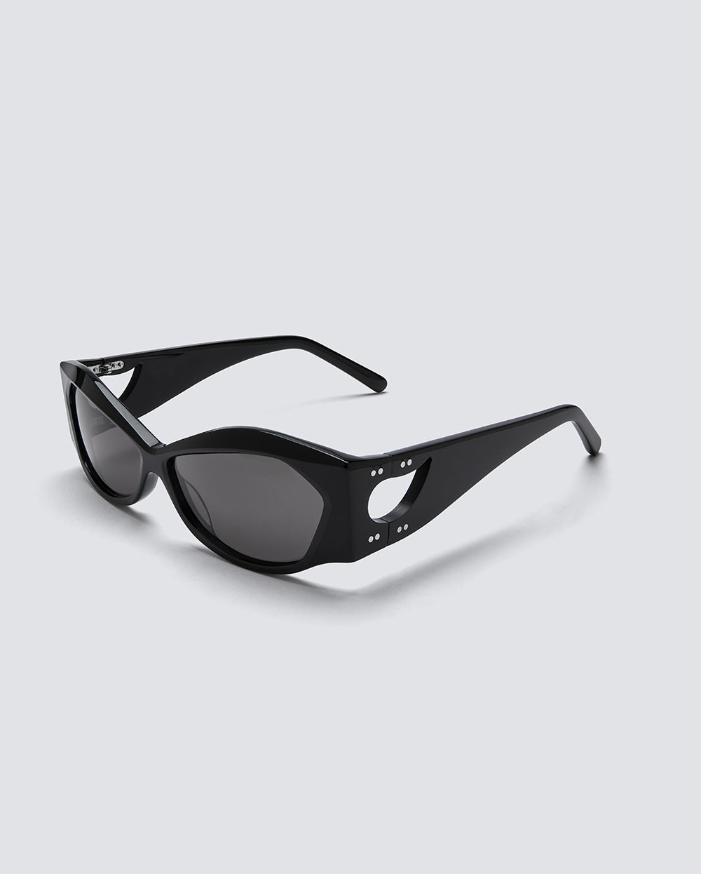 Black acetate frame with mirroring teardrop cutouts, black lenses