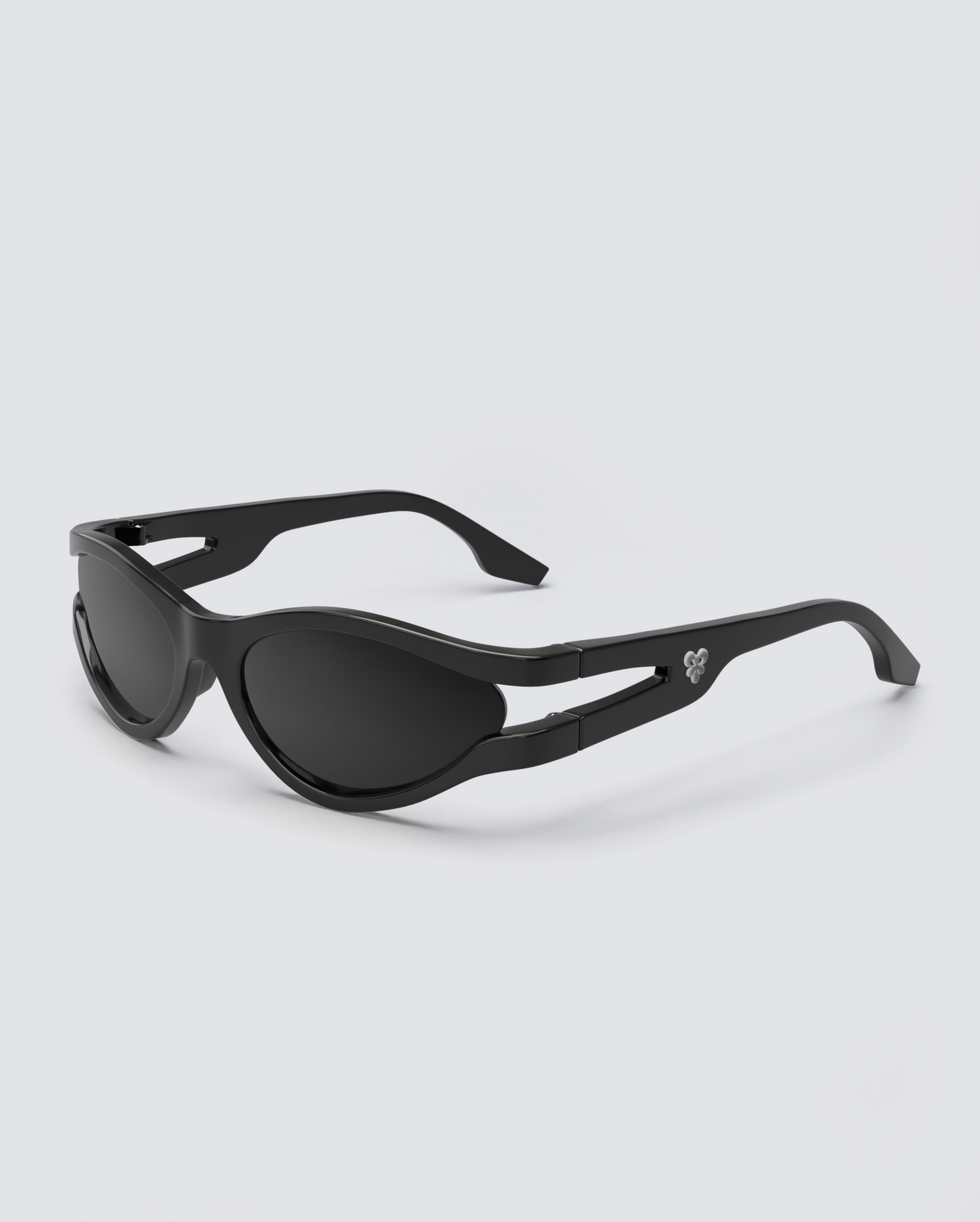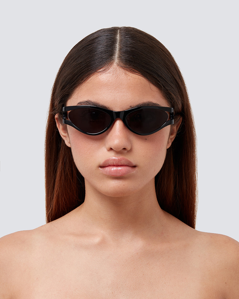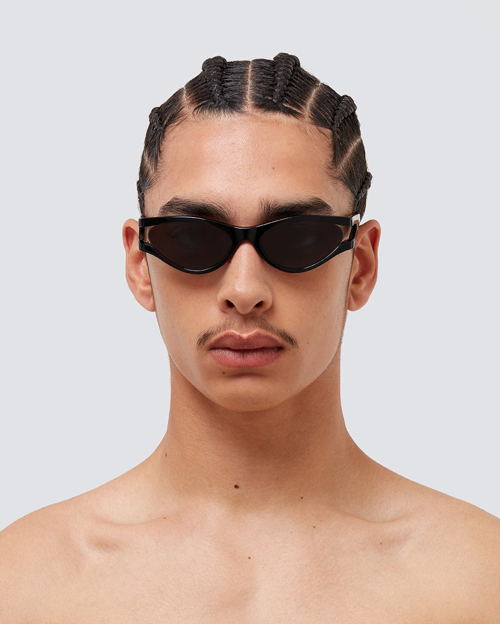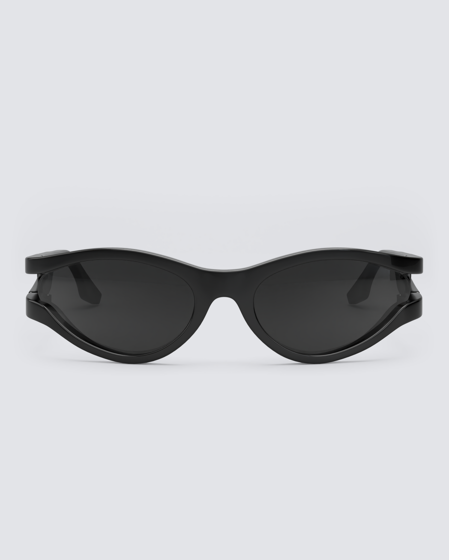 JUNEI BLACK are unisex sunglasses featuring a cat eye silhouette in black acetate with tone-on-tone black nylon lenses. The wrap around frame curves around the lenses to creating a graphic negative space in between the frame and the temples. These sunglasses are optical compatible.